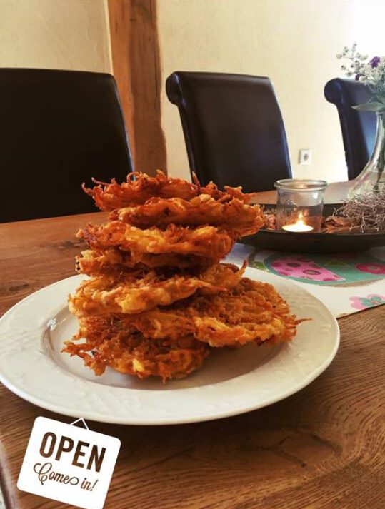 Knusprige Reibeplätzchen zum Sattessen, dazu frisches Apfelmus und Oma´s Schnibbelbohnensuppe – herrlich lecker!